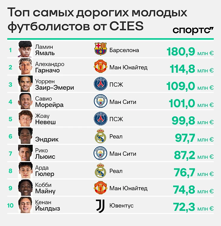 ● Статистическая модель CIES считает, что помимо Ямаля дороже 100 млн стоят еще три игрока: вингер «МЮ» Алехандро Гарначо (почти 115 млн), полузащитник «ПСЖ» Уоррен Заир-Эмери (109 млн) и вингер «Ман Сити» Савиньо (101 млн). Совсем недалеко от этого ценника также опорник «ПСЖ» Жоау Невеш и нападающий «Реала» Эндрик.
