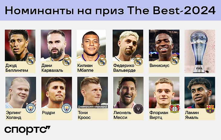 ● Обладатель «Золотого мяча» Родри тоже в борьбе. Из топ-10 «ЗМ»-2024 на The Best не претендуют Лаутаро Мартинес (7) и Харри Кейн (10). Зато в списке Флориан Виртц (12), Федерико Вальверде (17) и Месси, которого на «ЗМ» предусмотрительно не номинировали.