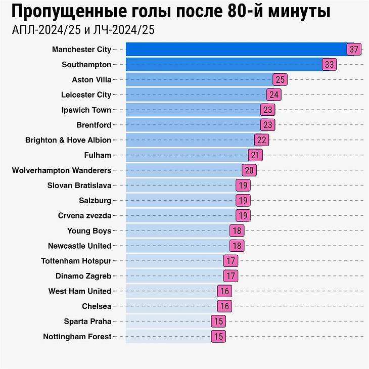 Из 52 пропущенных «Сити» в этом сезоне сразу 37 пришлись на последние 10 минут матча плюс добавленное. Это худший результат среди английских команд – даже «Саутгемптон» держится лучше (33 мяча). У Пепа серьезные проблемы в концовках – он не может укрепить игру или освежить команду заменами.