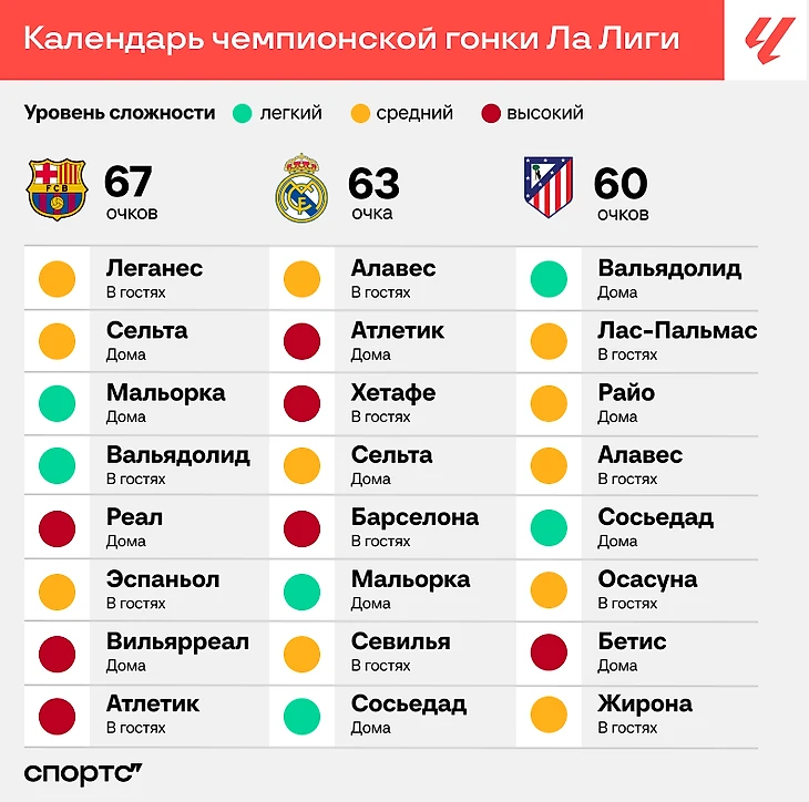 У «Атлетико» самый простой календарь среди конкурентов – пожалуй, единственное преимущество Симеоне на последнем отрезке сезона. Самый статусный соперник – «Бетис», команда идет на уровне «Барселоны» в 2025-м и только что не проиграла в Каталонии.