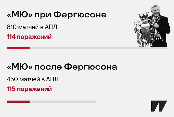 ● К 115 поражениям «Юнайтед» пришел за 12 лет после ухода Фергюсона. При шотландце же в рамках АПЛ играли 21 год.