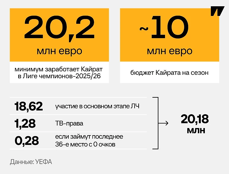 Тут мы сознательно говорим именно про 20,18 млн евро, которые «Кайрат» получит от УЕФА – понятно, что выход в ЛЧ спровоцирует интерес спонсоров, сами четыре домашних матча сгенерируют выручку тоже.