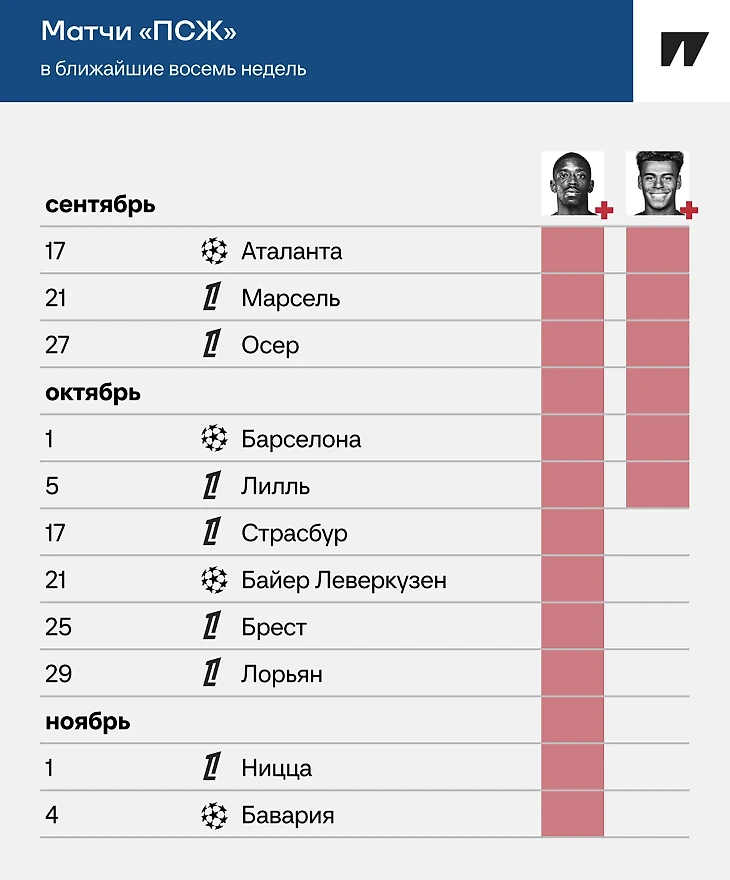 Пока неизвестно, сколько пропустят трое травмировавшихся в игре с «Лансом» футболиста, поэтому еще раз показываем картинку с дальнейшим расписанием «ПСЖ» и возможным пропуском матчей уже утвержденных травмированных Дембеле и Дуэ.