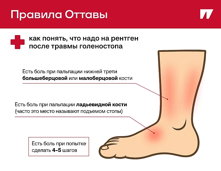 Нет деформации, боль терпимая – можно попытаться поднять человека, чтобы он попробовал пройтись, и от этого уже дальше отталкиваться. Вообще, для перелома костей стопы и нижней части голени есть правила Оттавы – они просты и доступны каждому (перечисление простых инструментов диагностики при травмах лодыжки или коленного сустава).