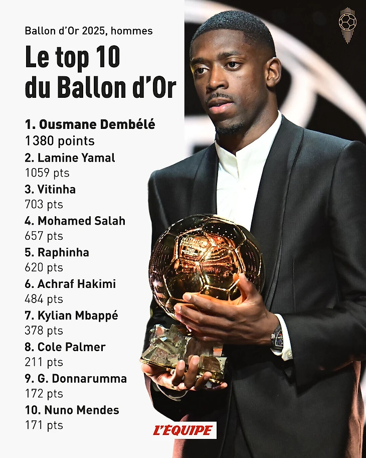 Вот на сколько Дембеле обошел Ямаля. «Золотой мяч»-2025: как голосовали