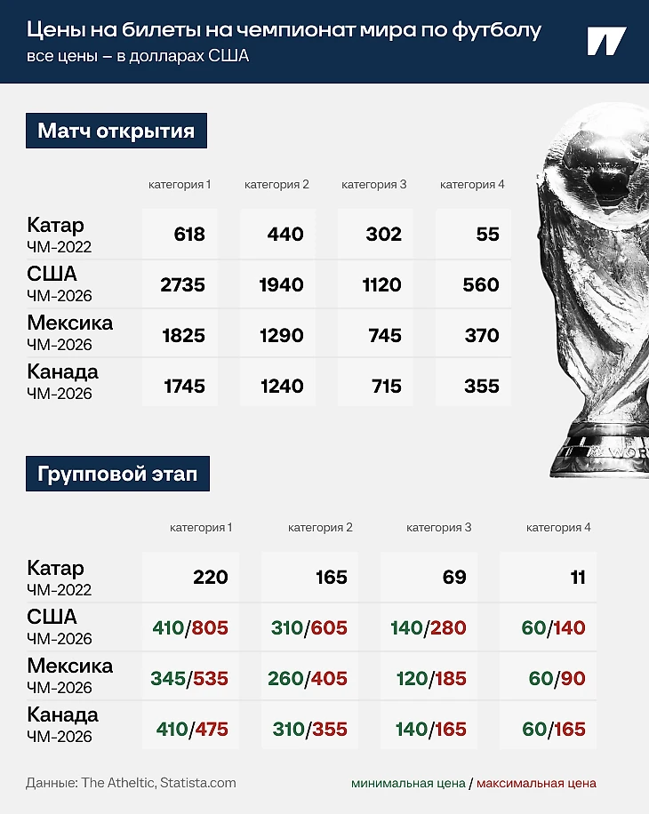 📈 Самые дешевые билеты подорожали в разы относительно ЧМ-2022 в Катаре. На матч открытия – в 7-10 раз, на групповой этап – в 6-14 раз. Подобный рост заметен во всех категориях, не только в самой дешевой.