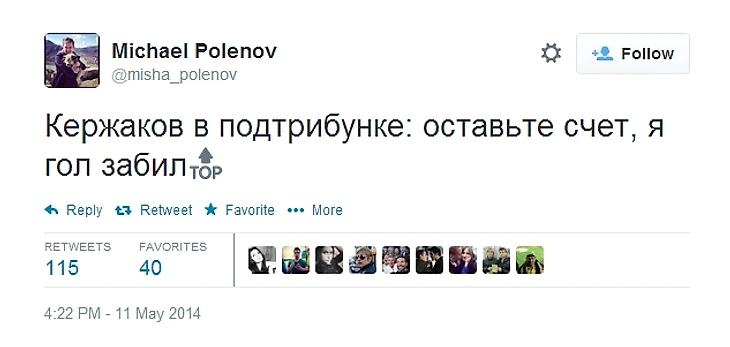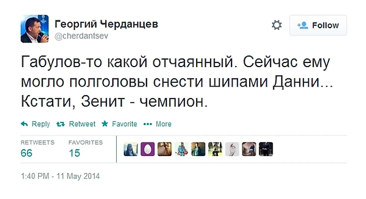16.49. Комментатор «НТВ-Плюс» Тимур Журавель в твиттере предлагает полюбоваться человеком, от рук которого пострадал Владимир Гранат.