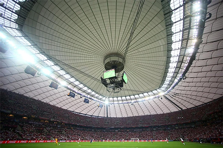 На Евро-2012 у нас было два проекта: Киев и Варшава. Я расскажу о Варшаве, потому что там мы взяли на себя всю ответственность за проект, строили под ключ и уехали со стройплощадки за две недели до первого матча. Если позволите, я остановлюсь на крыше. Кто-нибудь катается на велосипеде? Крыша напоминает велосипедное колесо со спицами, не так ли? Перекрытие поддерживается иглой в середине, а кольцо сжимания держит вес стадиона. Клиент посмотрел наш чертеж и тут же сказал, что им нужен большой экран на этой игле. Но и это еще не все: заказчик решил, что эта крыша должна убираться, что она должна быть складной. В итоге крыша открывается и закрывается за 5 минут. Разумеется, все это делается автоматически, с помощью аппаратуры.