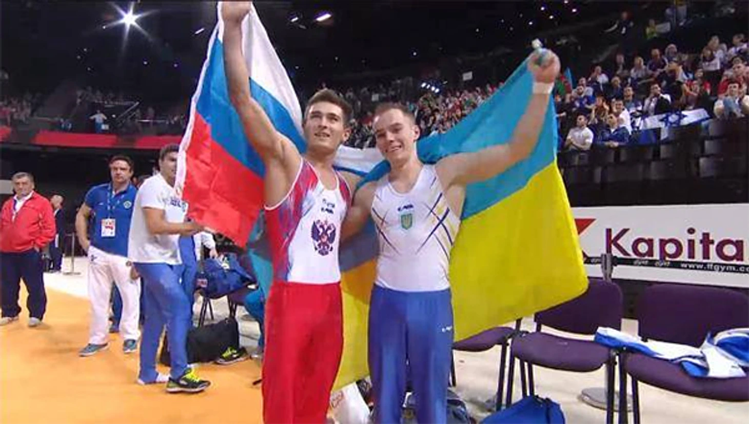 Украинец Олег Верняев и россиянин Давид Белявский, призеры Евро-2015 по спортивной гимнастике, показали, как правильно реагировать на политику.