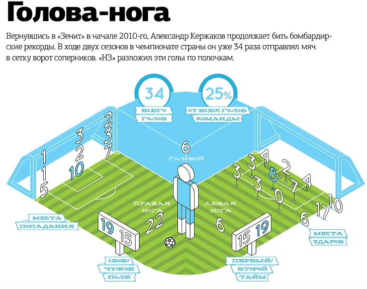 Вы будете смеяться, но сезон-2010 у итальянца Кержаков провел в режиме оммажа ОВНП: в первых 14 играх забить удалось всего 2 гола. Зато в последнем матче первого круга Керж оформил роскошный дубль в ворота Сергея Рыжикова. Я помню примерно голов 50 главного героя этой истории в деталях, но та пара до сих пор стоит перед глазами: мой сын выводил Вячеслава Малафеева на матч, я в целом был переполнен окситоцином, а тут еще Кержаков забил два. К декабрю-2010 Кержаков положил под 15 мячей во всех турнирах, с левой, с правой, головой, в касание, с подработкой. Журнал «Наш Зенит» сделал когда-то шикарную инфографику: площадь ворот и отметки Сашиных мячей. В этом прямоугольнике не было пикселя, в который был Кержаков бы не забил.