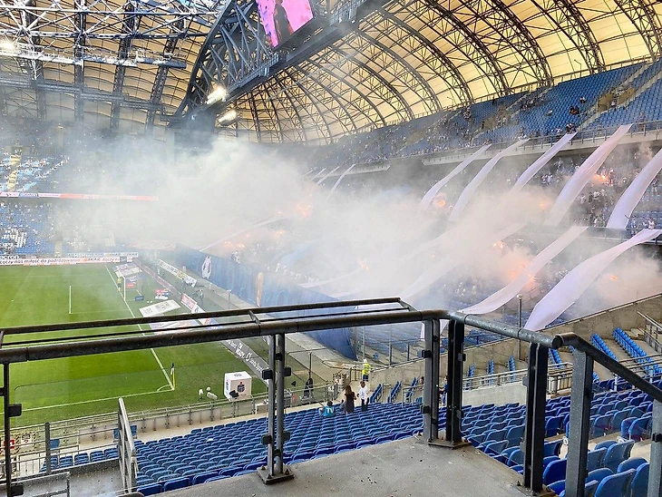 Познаньцы поменяли пару букв в первом слове и получилось «pelota o plomo» («мяч или свинец») – девиз, более подходящий футбольному матчу. Также для своей «оправы» фанаты Леха использовали файера – из-за них первые минуты игры футбольное поле немного заволокло дымом.