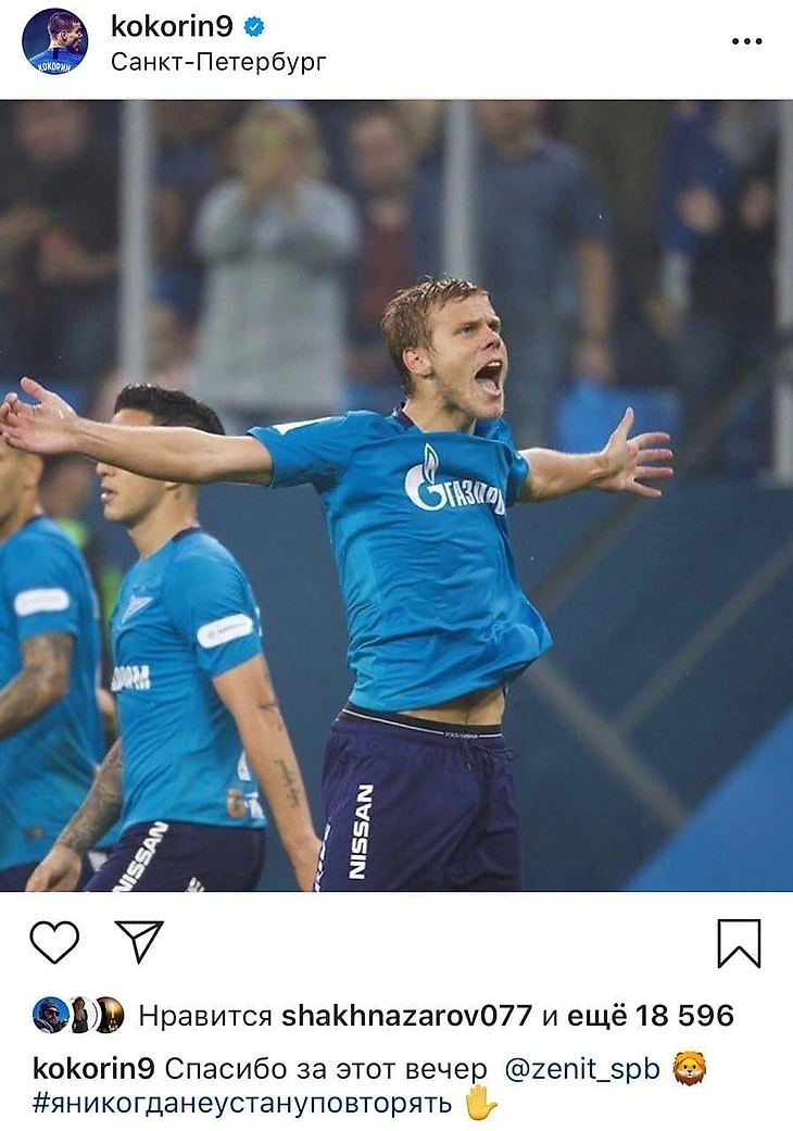 Мы же к нему добавим фотографию из инстаграма Александра, которую сопровождает довольно любопытный хэштег #яникогданеустануповторять. Любители отечественного футбола знают продолжение этой кричалки, которую чаще всего используют фанаты ЦСКА, «Зенита» и «Динамо». И там явно не «хочу за Спартак играть», а что-то более жёсткое. Кстати говоря, Кокорин уже удалил это фото вместе с подписью со своей страницы. Но, как говорится, интернет всё помнит.