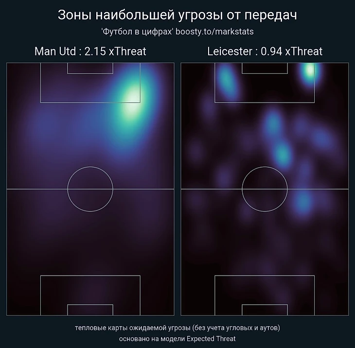 В итоге тренерская задумка сработала просто отлично. Вся угроза на ворота Лестера приходила именно с правого фланга/полуфланга. Это хорошо видно по зоне наибольшей угрозы от передач (картинка ниже). Эту роль плеймейкера на фланге можно сравнить с ролью Зиеша в Аяксе Тен Хага, у него был примерно тот же функционал и влияние на игру команды.