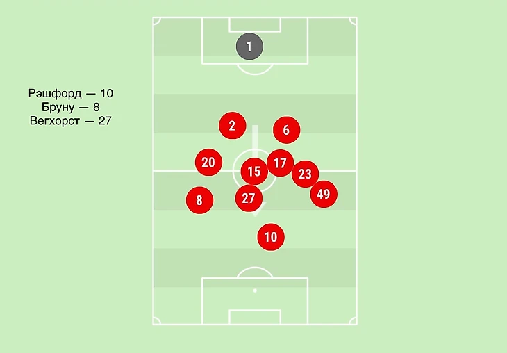 Вся нетипичность этого выступления португальца сводится к его позиции. Тен Хаг использовал максимально нестандартную расстановку игроков, где Маркус Рэшфорд играл в центре нападения, Ваут Вегхорст — под нападающим, а Бруну Фернандеш — ближе к правому флангу. Мне кажется нидерландский тренер сделал это для того, чтобы главный созидатель его команды оказывался с мячом под меньшим давлением и получал больше возможностей обострять, ведь ближе к бровке это делать проще, чем в центре, т.к. плотность игры там, зачастую, не так высока.