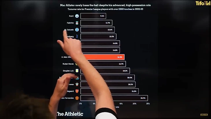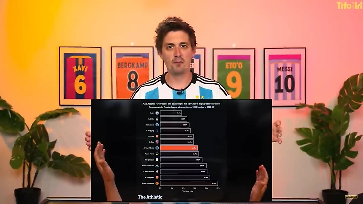 Tifo IRL является младшим братом Tifo Football и также принадлежит The Athletic. Этот канал менее популярен (380 тысяч подписчиков), т.к. на нем поднимаются темы, актуальные для более погруженных и, следовательно, менее многочисленных зрителей, например, «Почему Мак Аллистер не починит Ливерпуль?», «Действительно ли Тен Хаг улучшил МЮ?» или «Как Хави спас Барселону?» В нашем футбольном интернете материалы подобного содержания зачастую создаются в виде текста, хотя видео формат лично мне более приятен. Он, правда, приносит больше трудностей с подачей, но тут с ней все в порядке. Во всех роликах Tifo IRL один из ведущих (коих я насчитал 5), стоя в кадре, рассуждает на какую-либо тему, иллюстрируя речь на огромной электронной тактической доске (Уверен, что Вадим Лукомский мечтает о ней).