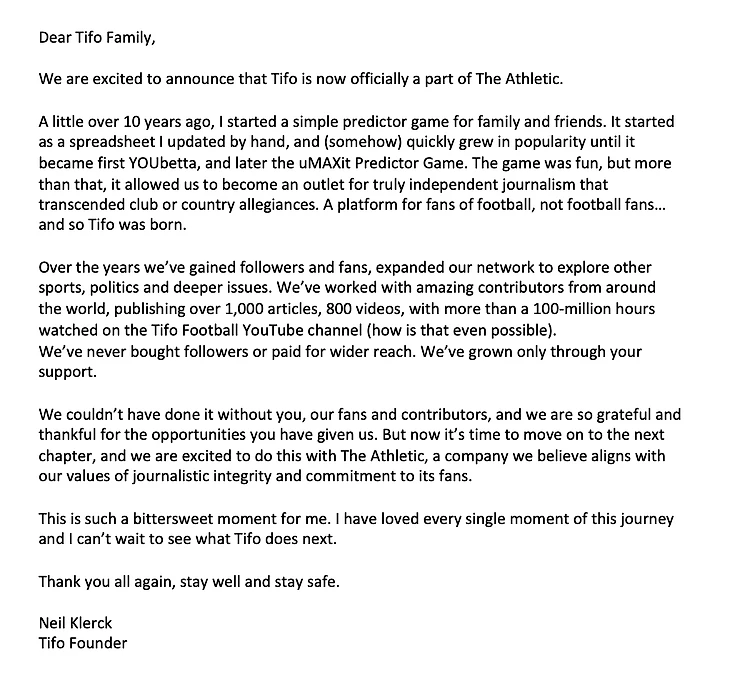 Это проект от одного из крупнейших мировых изданий The Athletic. О нем мне рассказал первый же комментарий и я пошел ознакамливаться. Для начала немного истории: канал был создан в 2014-м, первое видео датируется 2016-м, а нынешнее название и начальная аудитория была набрана лишь в 2017-м, под крыло газеты проект попал в 2020 и сейчас насчитывает аудиторию порядка 1,6 миллиона подписчиков. По словам самого автора сначала это было что-то вроде игры с прогнозами, которая набрала популярность и дала возможность для старта всему проекту. Информация взята из одного из постов Твиттера канала.