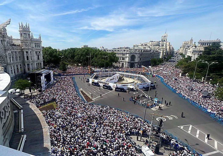 Объясняется выбор места центральным расположением площади и удобством локации для всего города. Реал Мадрид празднует тут все титулы с середины 1980-х, кроме, очевидно, ковидного сезона 19/20 и 34-го чемпионского титула клуба. Интересно, что первыми трофей сюда привезли победители из Атлетико в 1962-м году, после того, как обыграли Фиорентину в финале Кубка обладателей кубков, но после долгой трофейной засухи команды в конце 20-го века королевский клуб (у которого тогда недостатка в этом плане не наблюдалось) присвоил площадь себе, оттеснив «матрасников» на 500 метров дальше, к фонтану Нептуна, где теперь они и празднуют победы. С историческим экскурсом все, так что теперь переходим к вечеринке 12.05.2024 и морю позитивнейших фотографий!