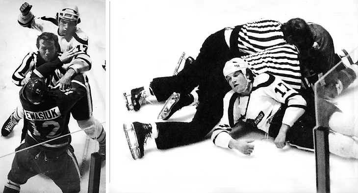 Как-то раз мы почти учинили бунт в Реджайне. Я был участником одной из этих шумных потасовок, которые часто случаются после драки. Уже наполовину покинув скамейку для штрафников, чтобы снова ввязаться в бой, я глянул на другую сторону площадки, где Данк, активно жестикулируя, показывал мне, чтобы я оставался на месте. Иначе я получил бы дисквалификацию. Тогда в Реджайне, наверное, впервые в жизни, я сделал вид, что подчиняюсь правилам. Я остался в боксе. Где-то еще на минуту. Затем их игрок атаковал нашего вратаря, а в моем понимании это было куда хуже, чем выскочить со скамейки штрафников.