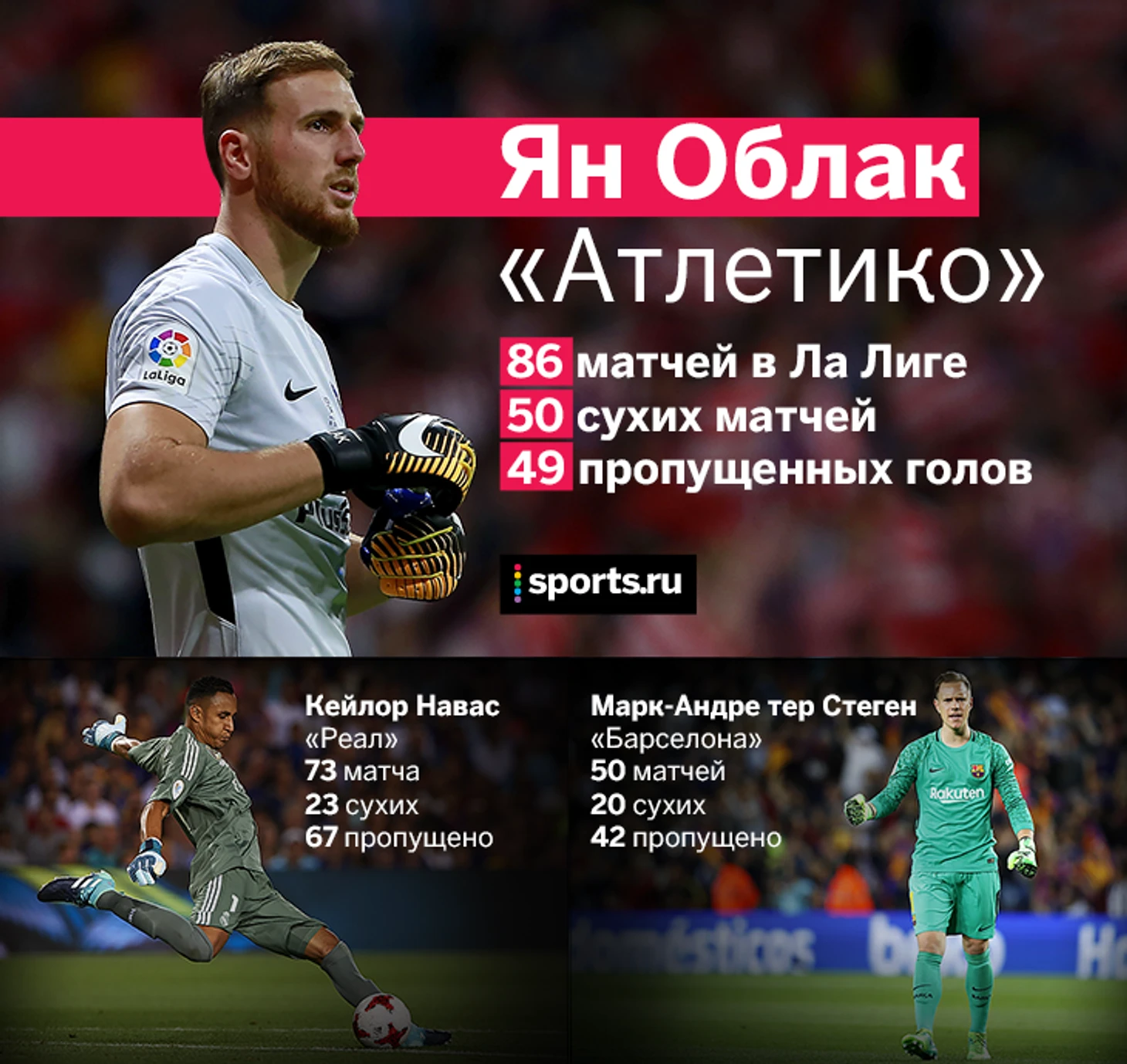 У вратаря «Атлетико» Яна Облака абсолютно выдающаяся статистика в испанской примере. В 86 матчах он накопил 50 сухих игр при 49 пропущенных мячах. Ничего особенного? Окей, сравните цифры Облака с показателями вратарей «Реала» Наваса и «Барселоны» тер Стегена: