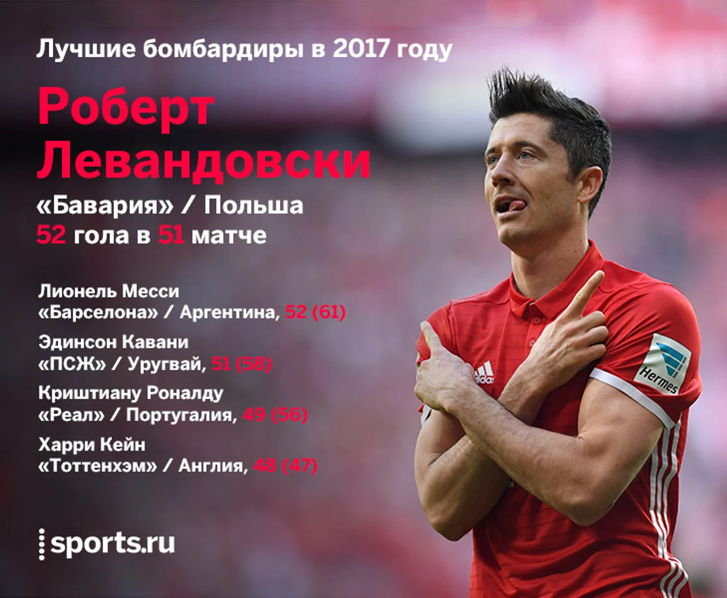Но это не главное. Чем бы ни занимался Роберт, лучше всего у него получается одно – забивать. И хотя болельщики «Баварии» часто жалуются на упущенные моменты, цифры Левандовского поражают. Он может стать первым после Месси и Роналду, кто в 21-м веке дотянется до 55 мячей за календарный год. В 2017-м у него уже 52 гола, впереди – еще 4 матча («Айнтрахт», «Кельн», «Штутгарт» в лиге и Дортмунд – в Кубке).