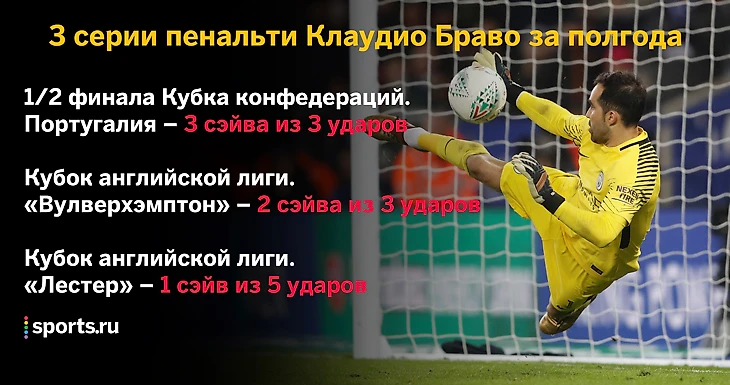 Это уже третья победная серия Клаудио всего за полгода. Самая значимая из них случилась в полуфинале Кубка конфедераций против Португалии: тогда Браво потащил все три удара и не пустил Криштиану Роналду в финал.