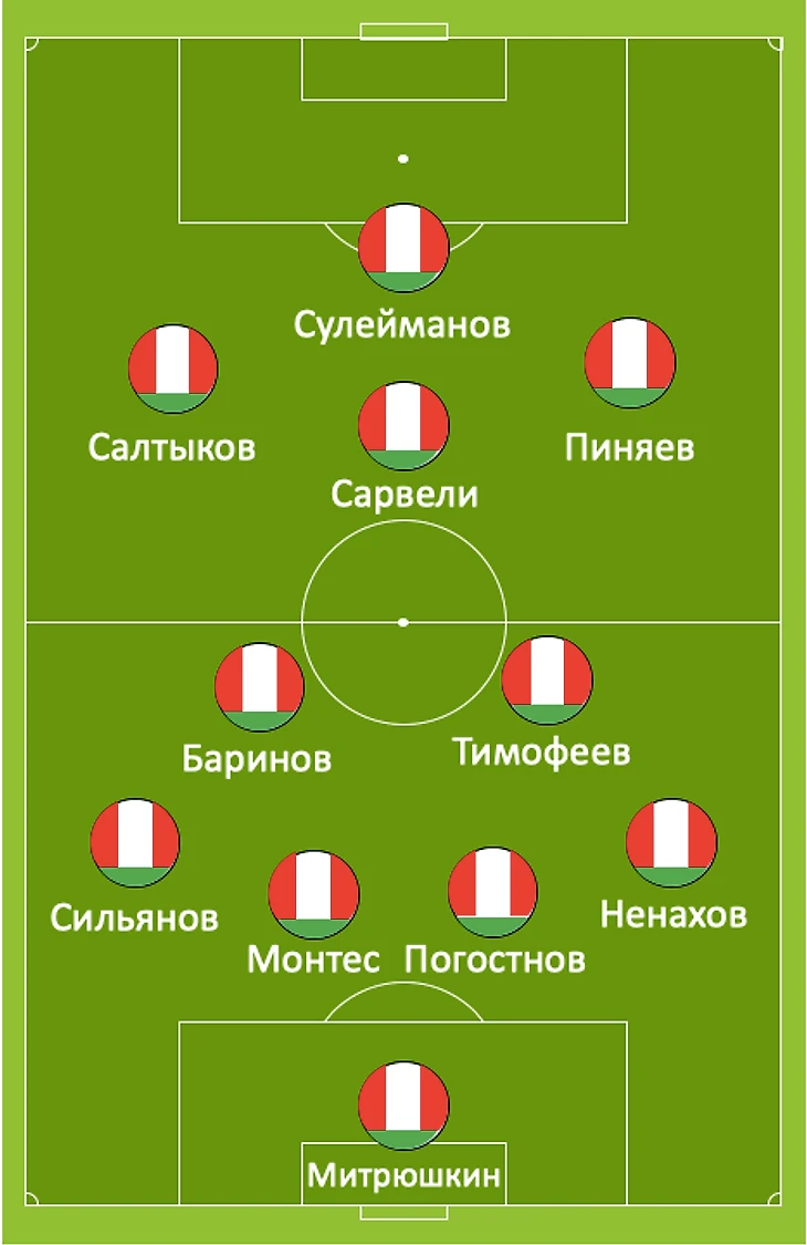 Относительно предыдущего кубкового матча с «Химками» 28 августа в основном составе произошла только одна замена. Тогда в центре обороны вышел Марио Митай. Теперь он на правах аренды перешел в «Аль-Иттихад» и будет играть с Бензема, Фабиньо, Канте, Бергвейном. А вместо него в старте появился новичок команды вице-капитан сборной Мексики Сесар Монтес. Отмечу и то, что Баринов, Ненахов и Сильянов постоянно появляются на поле с первых минут и в кубке, и в чемпионате. Александр так и вовсе каждый раз проводит полные 90 минут. А еще он попал в список 33 лучших футболистов сезона 23/24 от РФС. Забегая вперед, после замены Баринова в этом матче, Сильянов получит капитанскую повязку. Кажется, мы недостаточно хвалим его за вклад в игру команды.