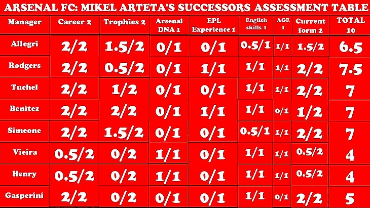 Подведем некоторые итоги вышесказанного в таблице. Оценив кандидатов по следующим параметрам: Карьера, трофеи, ДНК Арсенала), опыт в АПЛ в качестве тренера, уровень Английского, возраст, текущая тренерская форма.В целом, очевидно, что нужен крепкий кандидат, с солидным тренерским опытом. Несколько достойных специалистов есть.