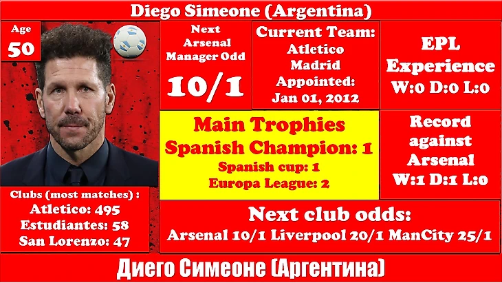 Вероятность попадания в Арсенал: Необходимейший Арсеналу человек. Однако, вероятность его перехода крайне невелика, по простой причине, отсутствия мотивации для такого перехода в глазах самого Симеоне. Уйти из Атлетико в нынешний Арсенал, да еще не имея никакого опыта работы в АПЛ и привязанности к Англии, как такое возможно.