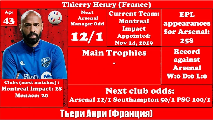 Вероятность попадания в Арсенал: Тьери Анри как человек душой болеющий за клуб, безусловно рискнул бы взвалить на себя эту ношу, однако едва ли руководство Арсенала, будет всерьез рассматривать его кандидатуру, уже обжегшись на таком же молодом и перспективном носителе днк Арсенала Микеле Артете.