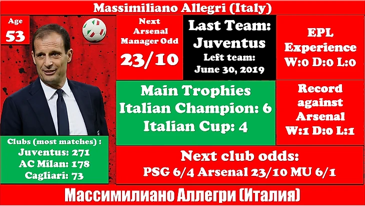 Вероятность попадания в Арсенал: Еще один фаворит прошлой гонки за кресло тренера Канониров, остается таковым и в этот раз. Кажется что Аллегри может быть заинтересован в приходе в АПЛ, тем более, что то он засиделся без работы. Руководство Арсенала, также должно быть заинтересовано в приглашении профессионала такого уровня.