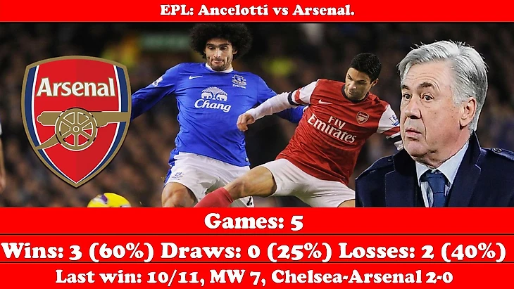 Анчелотти провел против Арсенала 11 игр, из них пять в рамках АПЛ, где перевес пока на его стороне.