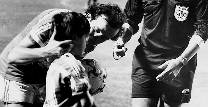 Фотография сделана в 1988 году перед прощальным матчем Платини. И это было одно из главных футбольных шоу того года – Мишель собрал всех звезд в одном месте. На Марадоне футболка с надписью No Drugs – нет наркотикам. Выглядит символично, если знать, какую жизнь вскоре начнет Диего. Кстати, возможно, Марадона подсел на наркотики уже тогда. Считается, что Диего начал употреблять или в «Барселоне» (играл там с 82-го по 84-й), или сразу после перехода в «Наполи» в 1984 году. Но попался он только в 1991-м.