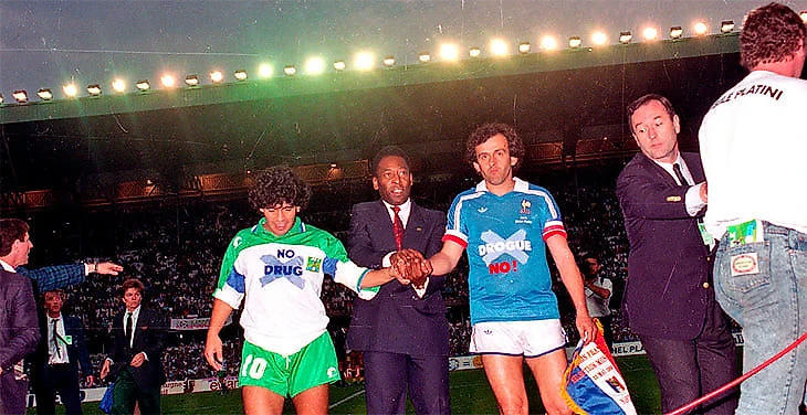 Фото Марадоны и Платини с надписью No drug: это прощальный матч Мишеля, героин в то время съедал пригороды Франции