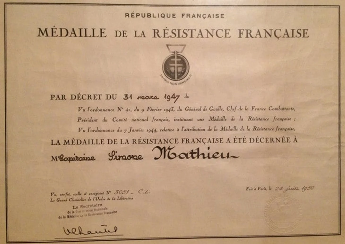 Грамота о вручении Матье медали сопротивления – награды «за веру и мужество сражавшихся во Франции и за рубежом, которые внесли вклад в сопротивление французского народа против врага и его пособников с 18 июня 1940-го»