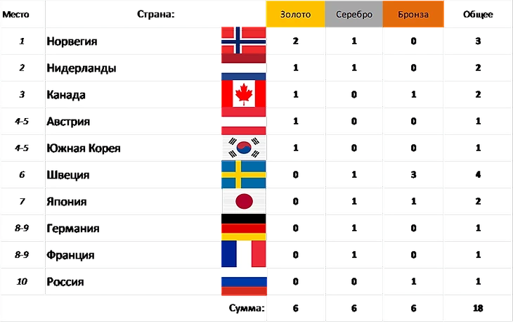 По первому дню тяжело делать выводы, но сильнейшие сборные уже начали усиленно выигрывать медали, а Норвегия, являясь фаворитом общего зачёта стала создавать отрыв. Также стоит отметить большое количество медалей у Шведского коллектива, это говорит об универсальности их команды, что поможет им в достижении поставленных целей. Не стоит переживать по поводу всего одной медали сборной России, плавность включения в борьбу всегда отличала нас от остальных сборных, да и не наступили ещё наши виды, которые обязаны принести нам медали.