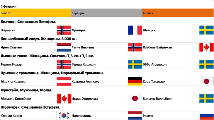 Итак, зачёт первого соревновательного дня (5 февраля), который является и общим медальным зачётом олимпийских игр 2022: