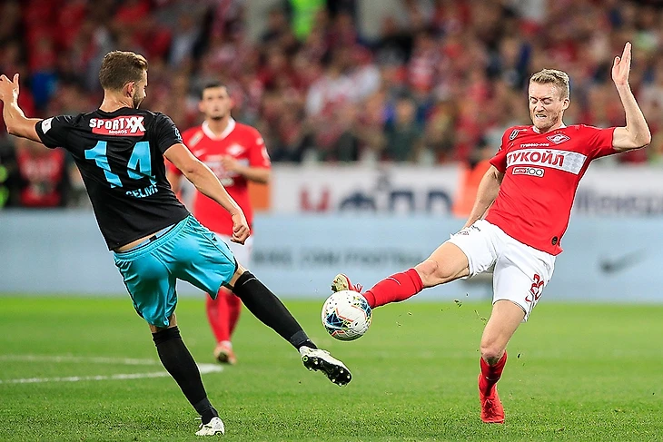 Лишь к 5' спартаковцы соорудили первую позиционную атаку. А именно Бакаев, после дальнего паса от Максименко, сделал зрячую на Понсе. Но быстро в штрафную попасть не удалось. Перепасовки привели к угловому. Который вынесли швейцарцы, правда в ноги тому же Зелимхану. Он повозился и дал круглого Шюррле. Но и ему не подфартило. Мяч выгрызли защитники, атаковав его и спереди и сзади. Пошла обратка на ворота Максименко. Её тормознули прессингом с нарушением. Свисток.