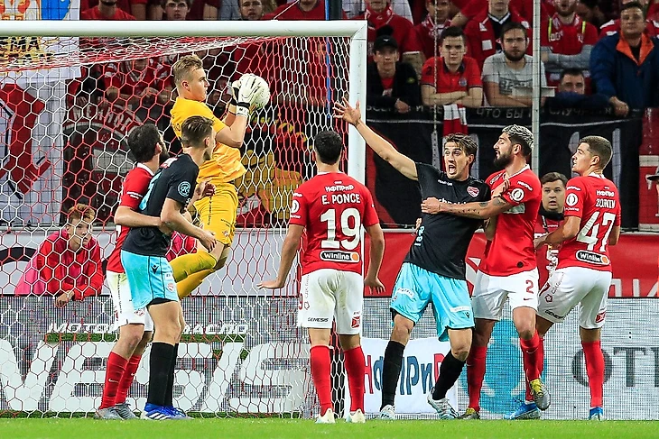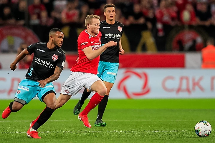 Правда тут же (это и хорошо, а то помчались все только в атаку, перегиб) случился казус. Мимо Гулиева, между тремя спартаковцами Зобниным Жиго и Джикой прокинул мяч Кастроман, на ход разогнавшегося №13 Симона Раппа. И вновь Максименко!