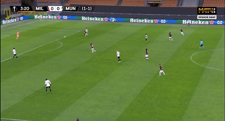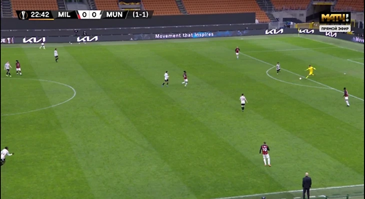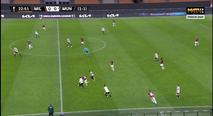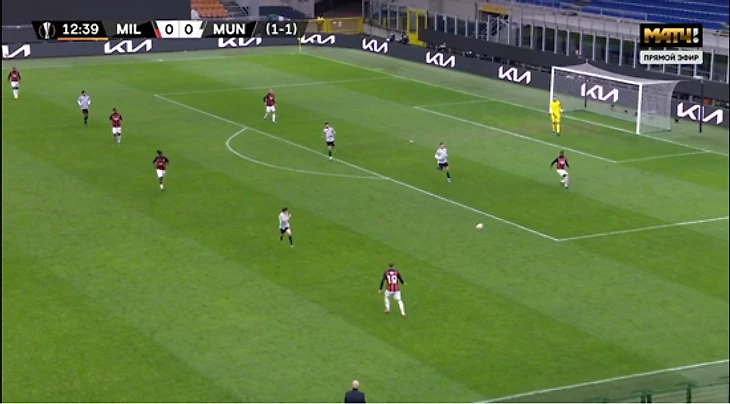Фернандеш выдвигается в прессинг до вратаря, Джеймс находится в полупозиции. Доннарумма прекрасно это видит и отдаёт точную передачу на Эрнандеса. В этот момент игроки "МЮ" не действовали слаженно в давлении. Из этого родился опасный эпизод. Мяч дошёл до Тео, он обыгрался с Круничем, затем ушёл на скорости к чужой штрафной, отыграв сразу несколько оппонентов: