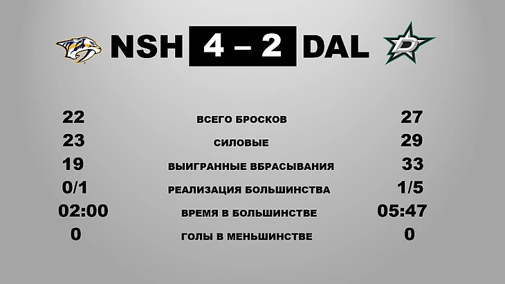 Сегодня Даллас принимал у себя в гостях Нешвилл. Видео встречи и статистика приведены ниже: