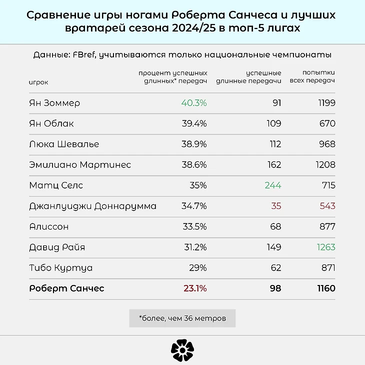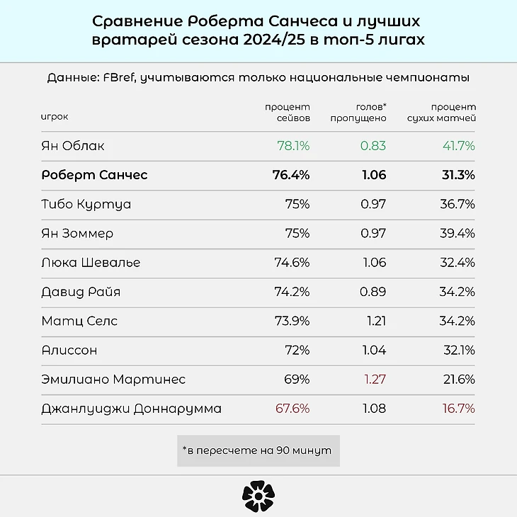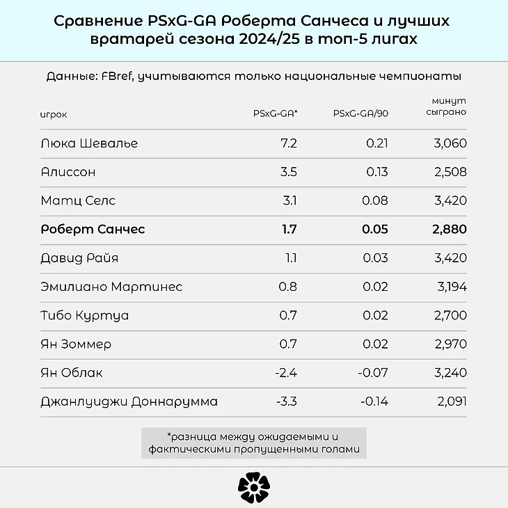 Роберт Санчес — просто нормальный вратарь на «четверочку»: великолепный шотстоппер, склонный ошибаться и слабо играть ногами. При этом по продвинутым метрикам он практически ничем не уступает лучшим на своей позиции.