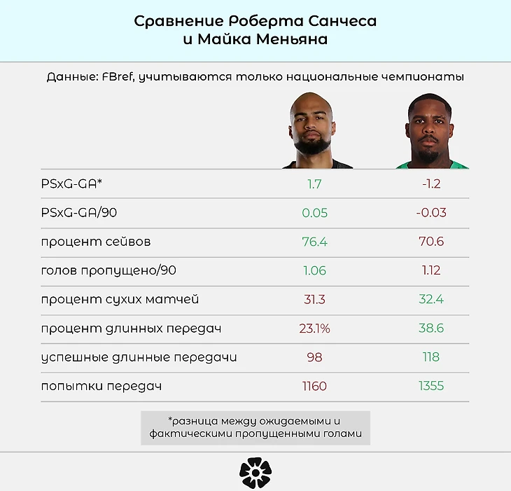 Сравнение с Майком Меньяном, чей трансфер в «Челси» активно обсуждался летом, тоже в пользу Санчеса. Испанец предотвратил на три гола больше и превзошел француза по проценту сейвов. Меньян же гораздо оказался сильнее в игре ногами: почти в два раза лучше Роберта по успешности длинных передач. Однако, в медиа потенциальный переход Майка позиционировался как серьезный апгрейд позиции. Мягко говоря, сомнительное суждение.