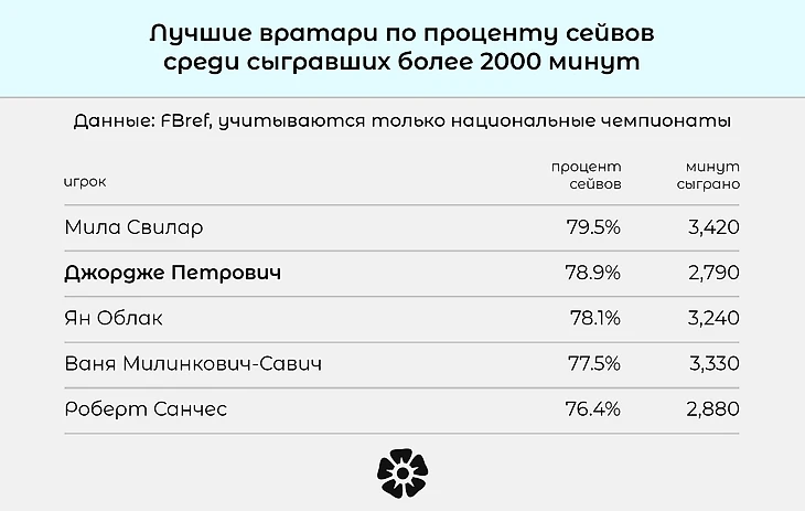 По проценту сейвов Роберт второй — уступает только Яну Облаку. А среди вратарей топ-5 лиг, сыгравших более 2000 минут, вообще входит в пятёрку лучших — просто вау!