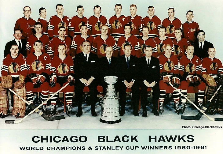 - Так... Напомните, пожалуйста, на чём мы остановились в прошлый раз... Ага... Джонни Готцелиг. Первый уроженец Российской Империи выигравший Кубок Стэнли. Первый уроженец Российской Империи поднявший Кубок Стэнли, как капитан. Первый уроженец Российской Империи работавший с клубом НХЛ в качестве главного тренера. Тем не менее, должен непременно напомнить, что Джонни Готцелиг убыл из этой самой империи и прибыл в Канаду будучи младенцем и будет совершенно некорректно говорить о нём, как о россиянине. Кстати, я говорил, что он, Готцелиг, поработал так же генеральным менеджером в женском бейсболе (софтболе - прим. авт.)? Говорил... А вот ещё фото. Передайте по рядам. "Чикаго Блэк Хокс" - обладатели Кубка Стэнли 1961-го года.