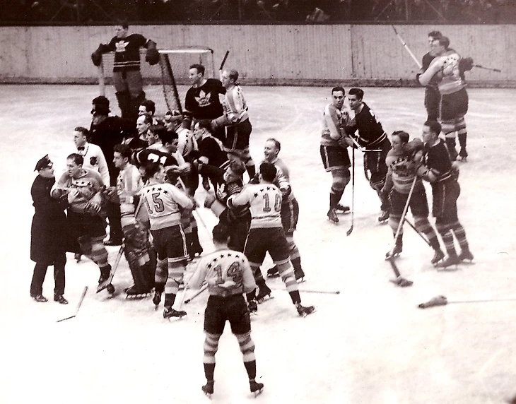 - А вот Вам ещё одно фото старого, "доброго", олдскульного хоккея. Нет, всё-таки матч, даже для тех времён, необычный - угомонить хоккеистов на лёд высадились полицейские. Дрались команда на команду, все, кроме вратарей. Так было написано в "Нью-Йорк Таймс". На снимке мы видим безучастного к происходящему голкипера "Мэйпл Ливз" Турка Броду. А вот "американец" Альфи Мур, опять же - судя по фото, совсем не скучал. И где-то, в гуще событий, фотообъективом, судя по всему, не выхваченный, принимает участие в "танцах на льду" Полковник Конн Смайт (правда, он потом утверждал, а я, как и многие другие, склонен ему верить, что появился на льду, чтобы урезонить "своего" главного агрессора - Реда Хорнера). К чему я всё это рассказываю... О-очень остроумно... Нет, не в этот самый момент Конн Смайт отпустил Суини Шрайнеру дифирамбы на счёт "лучшего левого вингера". Но Вы правы, фотография интересна тем, что на ней изображены две команды Шрайнера - настоящая и будущая. В межсезонье 1939-го года Конн Смайт инициировал беспрецедентный трейд 5 на 1. Очень редкий формат трейда, даже если 5 - это откровенный "самосвал дров", но тут ещё и в трейд-блоке принимал участие будущий член Зала хоккейной славы Харви "Бушер" Джексон. И "потолка зарплат", заметьте, тогда ещё не было, т.е., нельзя предположить, что "сплавлялись" тяжёлые контракты. Другими словами, я пытаюсь подчеркнуть, что Полковник Смайт свои слова о Шрайнере подкрепил таким вот действом. Хотя... Нет, ни тогда Смайт сказал о Шрайнере, как о лучшем левом вингере.