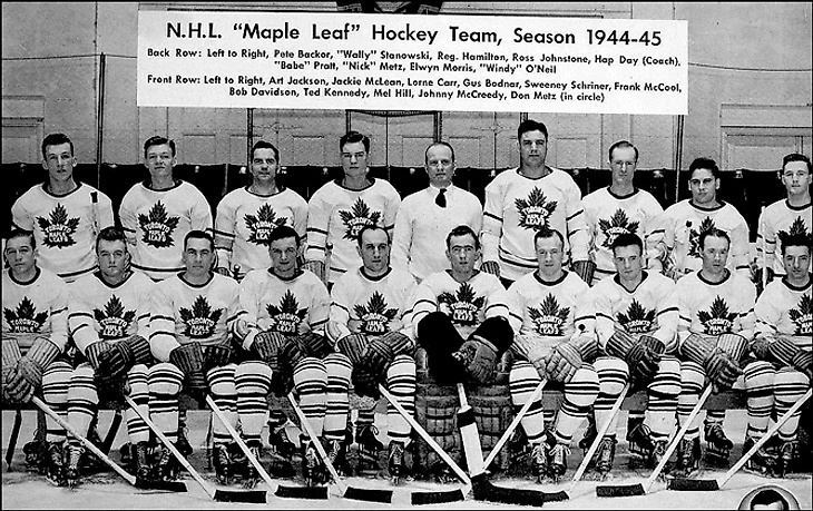 - "Торонто" тем временем был разгромлен в плей-офф Кубка Стэнли принципиальными соперниками из "Монреаль Канадиенс" в пяти матчах с общим счётом 6:23(!). Офицера пора было вызывать из запаса. Полковник Смайт лежал в госпитале в Европе, Джек Бикелл, его партнёр в "Мэйпл Ливз", оказался более сговорчив (после фиаско любой, я думаю, станет сговорчивым), контракт был подписан, сезон 1944-1945 начался. В первых девяти матчах Шрайнер забил 11 шайб и шёл по графику взлетевшей "Ракеты" Ришара. Но затем последовала травма, а после - ещё одна. В результате, Суини провёл лишь 26 матчей в регулярном сезоне, забив в них 22 гола. Ришар, к слову сказать, выбил 50 в 50 матчах. Но мы-то с Вами знаем, что плей-офф - всему голова. А в полуфинале "Мэйпл Ливз" встретились именно с "Монреаль Канадиенс" во главе с Морисом "Ракетой" Ришаром. Сразу скажу то, что отмечалось в СМИ того времени - плей-офф проходил на фоне необычайного эмоционального подъёма у людей. По-че-му?... Да, нетрудно догадаться. Человечество приближало победу в страшнейшей войне. Но плей-офф - своя, локальная, вечная война, особенно, если играют "Монреаль" и "Торонто". "Монреаль", с лёгкостью выигравший регулярный чемпионат, считался, и заслуженно, фаворитом в плей-офф. Но и Хэп Дэй уже давно доказал всем, нам-то во всяком случае, что он далеко не тот парень, что вышел "пожевать жвачку" за скамейкой запасных. Он напрочь исключил возможность принимать шайбу на скорости Морису Ришару, плюс - новичок "Ливз" - вратарь Фрэнк Маккул "стоял на ушах", поймав свою игру. А за считанные секунды до окончания третьего периода Тед Кеннеди забросил единственную в матче шайбу. 1:0. Во втором матче голов было больше, но победа вновь досталась "Мэйпл Ливз" - 3:2. В первом матче в Торонто "Канадиенс", наконец, показал, кто в серии фаворит - 4:1. В четвёртом матче забил, в конце концов, и Ришар, но и Шрайнер не остался без ответа, матч перешёл в овертайм, где всё решил точный бросок торонтца Гаса Боднара - 4:3 в матче и 3:1 в серии. В пятом матче показалось, что всё встаёт на свои места - "Ракета" забросил 4 шайбы, а "Монреаль" победил 10:3, но далее следовал матч №6. Ришар и Шрайнер вновь обменялись голами, а победа досталась-таки "Торонто" - 3:2 и 4:2 в серии. Далее повторялся финал 1942-го года - "Мэйпл Ливз" - "Ред Уингз".