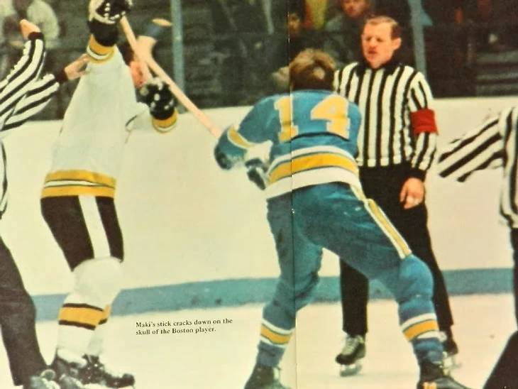 21 сентября 1969 «Брюинз» и «Блюз» играли в Оттаве выставочный матч. В какой-то момент между Тедом Грином («Бостон») и Уэйном Маки («Сент-Луис») вспыхнула драка. Но драка не простая - хоккеисты начали безжалостно дубасить друг друга клюшками. Последний удар остался за Маки. Грин рухнул с проломленным черепом. Его срочно увезли в больницу, где была сделана сложнейшая операция, спасшая Теду жизнь. Тем не менее - следующий (чемпионский) сезон он вынужден был пропустить. Против Грина и Маки было заведено уголовное дело (впервые в истории НХЛ за происшествие на хоккейной площадке), но оба были оправданы. Грин, пропустив год, впоследствии вернулся на площадку и выиграл-таки «свой» Кубок с «Бостоном» в 1972-ом, а после ещё несколько лет успешно выступал в ВХА за «Нью-Инглэнд Уэйлерз». А вот Уэйн Маки... Провёл за «Блюз» лишь 16 матчей в том самом сезоне 1969/70, затем перешёл на драфте расширения-70 в «Ванкувер Кэнакс», а потом... У него была обнаружена опухоль головного мозга, и он умер в 1974 году. Я нигде не нашёл какой-либо связи между «той» дракой на клюшках и смертью Уэйна. Будем считать, что её нет.