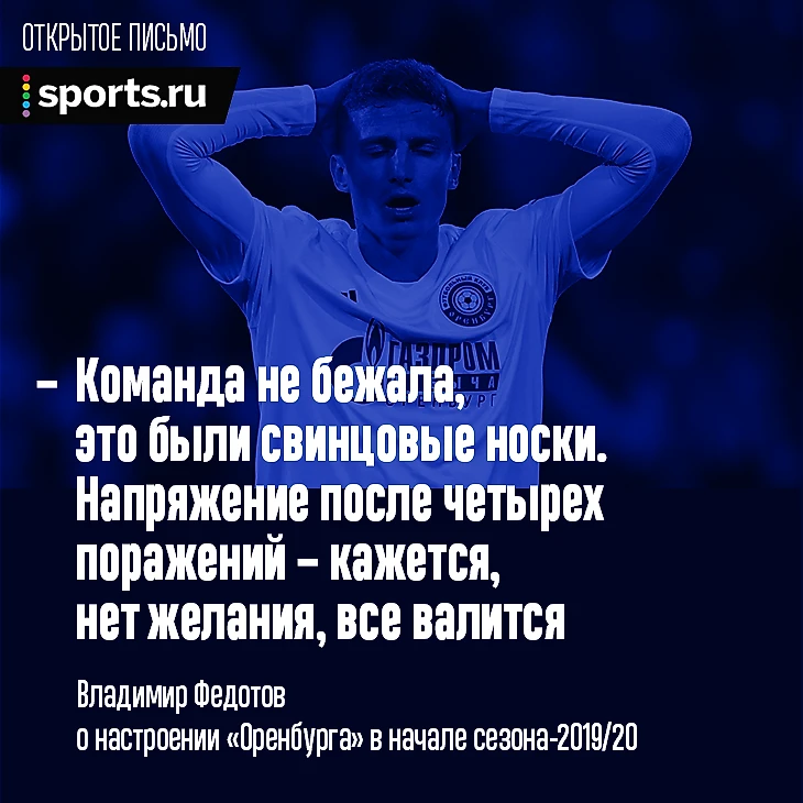 В выходные Федотов ушел из «Оренбурга» и осмыслил весь путь команды в открытом письме на Sports.ru. Напоминаем, что в рубрике «Открытое письмо» тренеры, игроки, менеджеры и все люди, связанные со спортом, откровенно говорят о том, что их волнует и интересует. Например, Сергей Паршивлюк рассказывал, как к 30 годам принял себя после серии травм, сломавших карьеру в «Спартаке», а тренер «Балтики» Евгений Калешин признался, что страдал от панических атак.