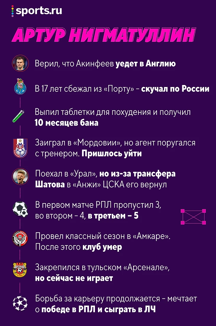 Вы точно знаете Артура Нигматуллина из «Арсенала», но вряд ли в курсе, каким был его путь до Тулы. Артур сравнивает свою карьеру с игрой, где в каждом сезоне поджидает новый босс. Это действительно так – просто оцените таймлайн препятствий Нигматуллина в битве за РПЛ.