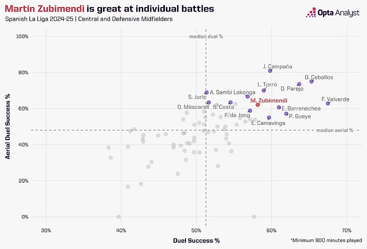 Субименди — не классический «разрушитель» в центре поля, но он эффективно отбирает мяч (как видно на графике ниже). Комбинация этого навыка с характерным для испанских полузащитников видением поля и умением находить партнёров разрезающими передачами создает значительную угрозу для соперников.